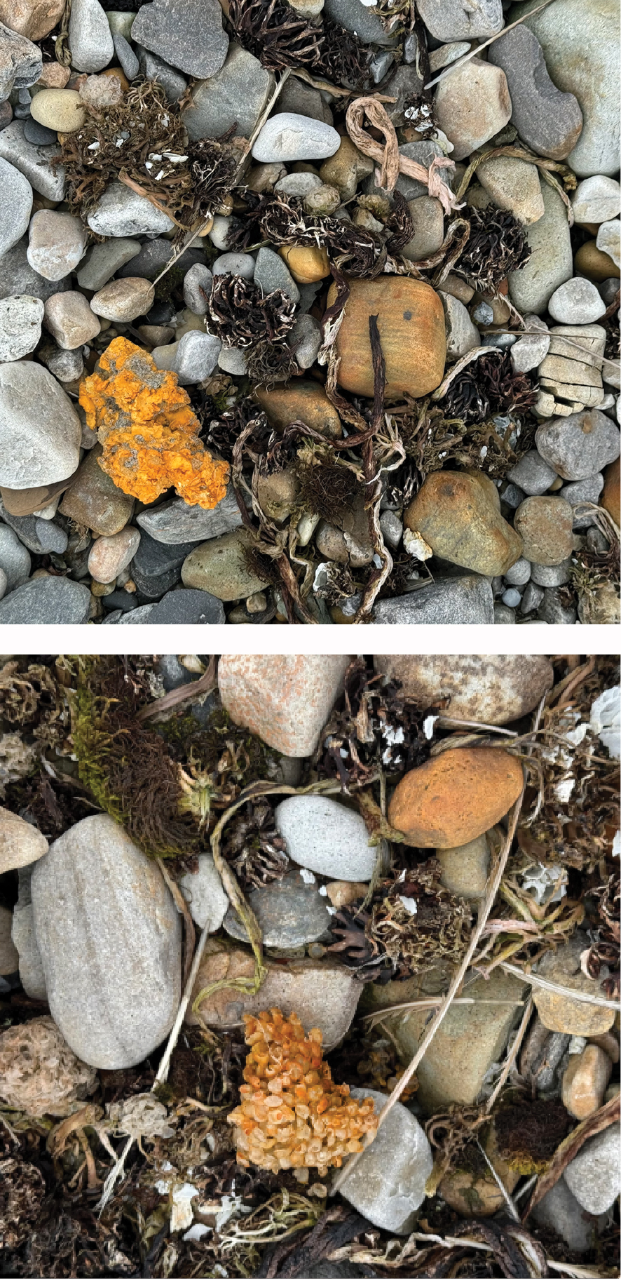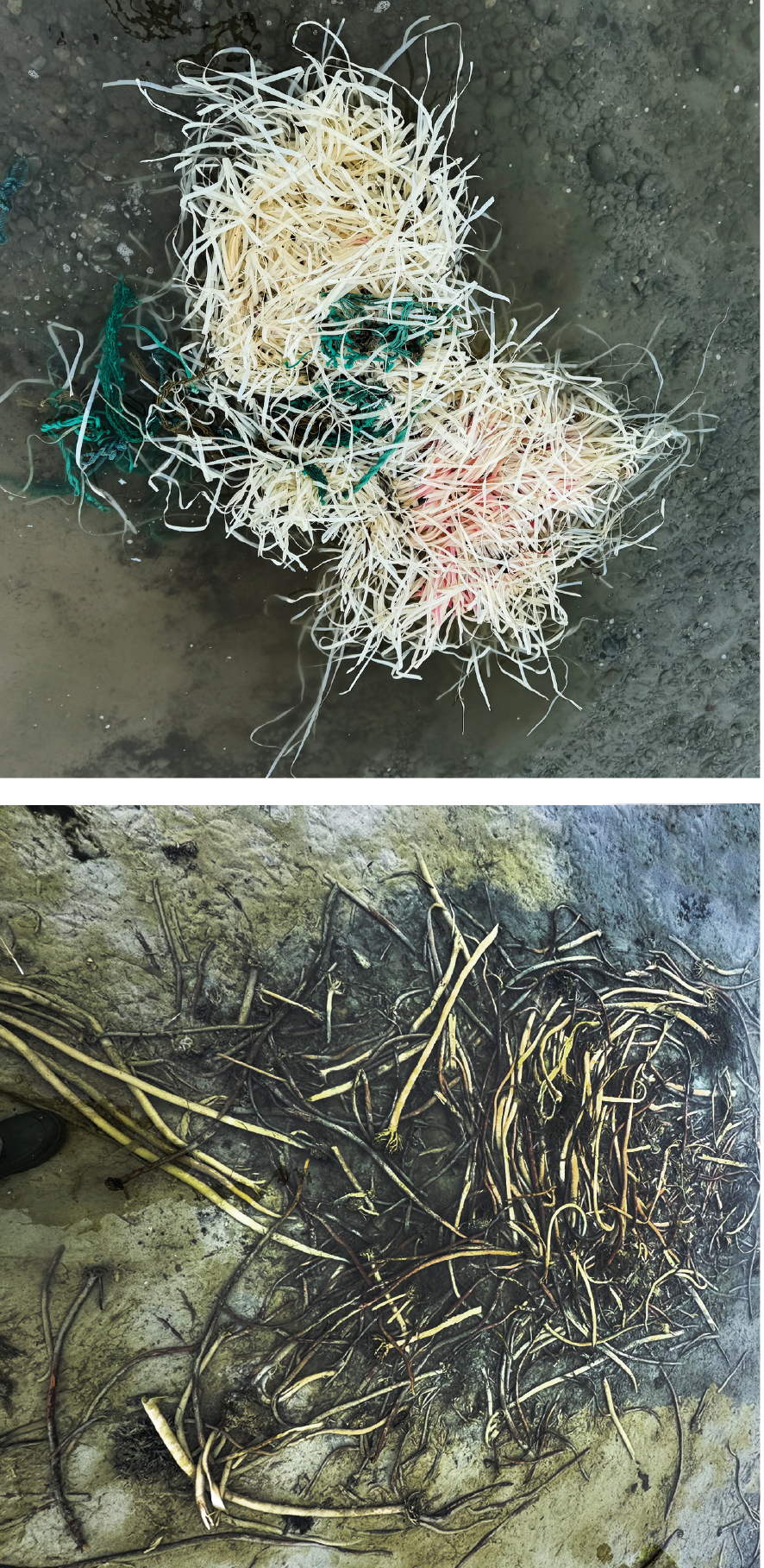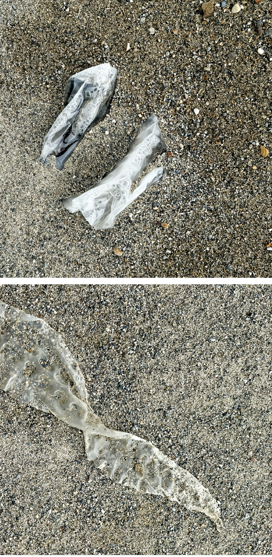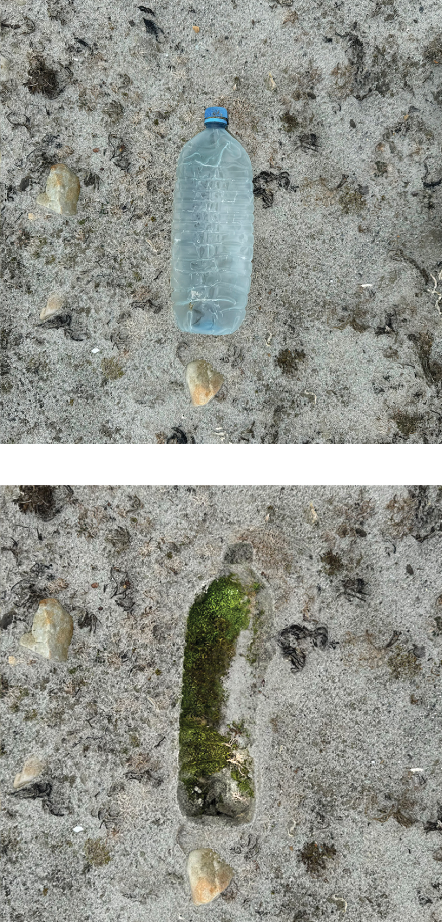 UV-bleached scraps of plastic film and crumpled PET bottles become indistinct from translucent strands of drying seaweed. Degraded pieces of synthetic foam perfectly mimic stranded sea sponges. Yellowed fragments of plastic containers pose as scattered animal bones. Tangles of strapping bands masquerade as messy heaps of algae from the deep sea. And, more confusingly still, the deception works both ways. Marine litter stops being a glaring discontinuity in Arctic aesthetics. Assuming the beauty — or the ugliness — of the natural features of Arctic scenery, it undermines its authenticity, turning the genuine landscape into one of pretence, while still remaining a foreign body, with all its potential impacts.