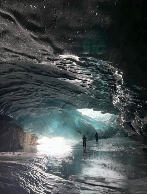After parking their snowmobiles, they put on headlamps. Aino took her gun in case of a polar bear. They climbed down the five-meter drop in a flurry of snow to land at the entrance of a huge ice cave. Inside, the walls gleamed sapphire and turquoise. Frost feathers dangled from the ceiling. Further in, ice diamonds glittered in the light of their headlamps. It was one of the biggest ice caves they'd seen.